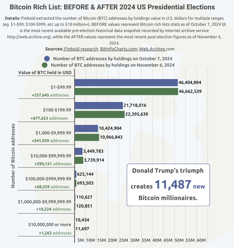- トランプ氏の当選で、11,000人以上の新たなビットコイン億万長者が誕生