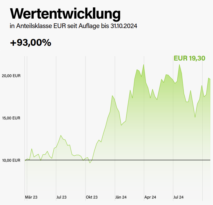 「Superfund Black Blockchain」の設定は2023 年 3 月 23 日ですが、設定来リターンは+93.00 %2024 年10月 31日時点)となっております。