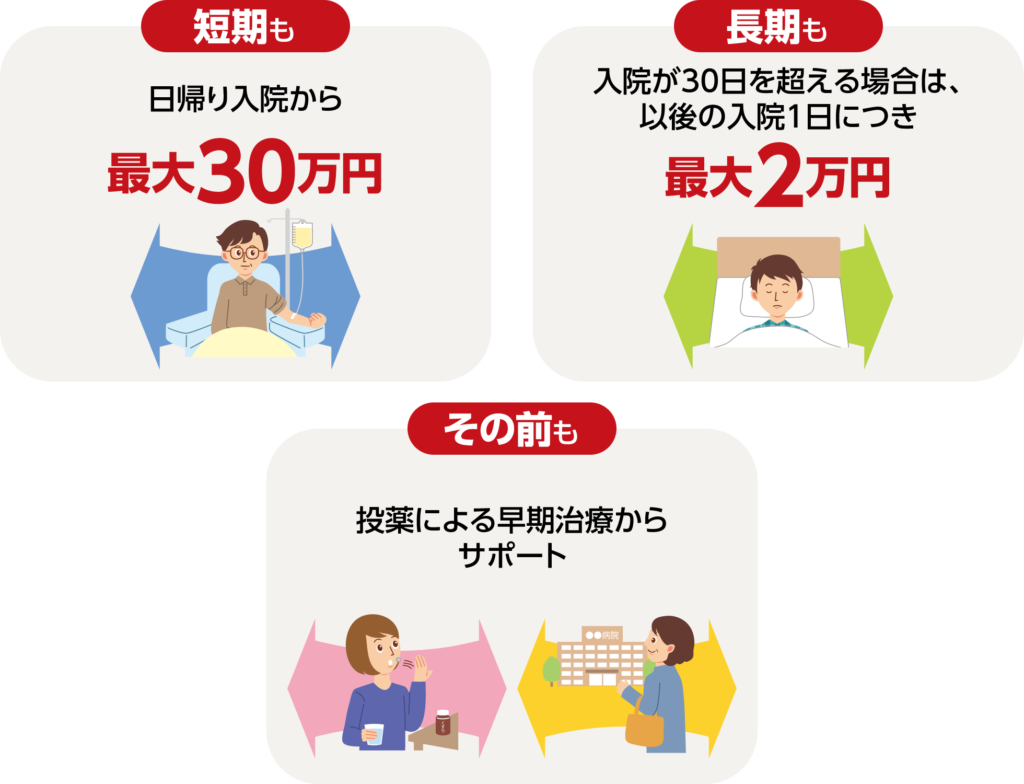 被保険者の日帰り入院から入院日数(30日まで)にかかわらずまとまった一時金を受け取れるもの。1回の入院につき1回、通算100回が限度。ただし、8大生活習慣病による入院の場合は無制限で支払い。