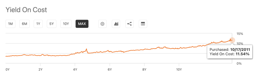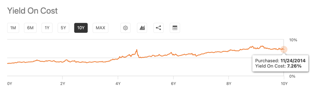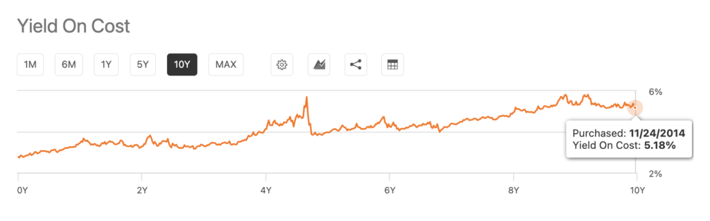 長期保有していれば分配金はどんどん大きくなっていくことはイメージできたかと思いますが、その結果、YoC(Yield On Cost)も高くなっていきます。