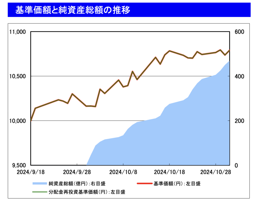 10月31日時点の月次レポートによると、10月末時点での資産残高は469.73億円、基準価額は10,790円、1ヶ月の分配金含めたトータルリターンは6.2%となっております。