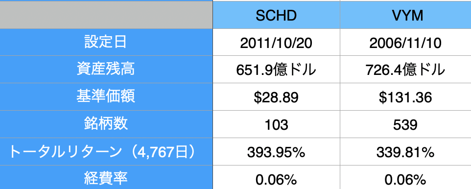 そのため、それぞれ本家である「SCHD」と「VYM」で比較します。