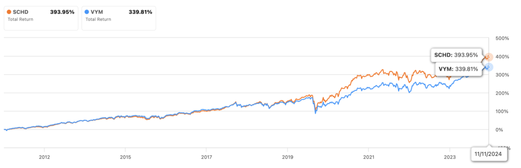 その結果、「SCHD」のトータルリターンは393.95%「VYM」は339.81%と、トータルリターンは「SCHD」の方がおよそ1.16倍高いですね。