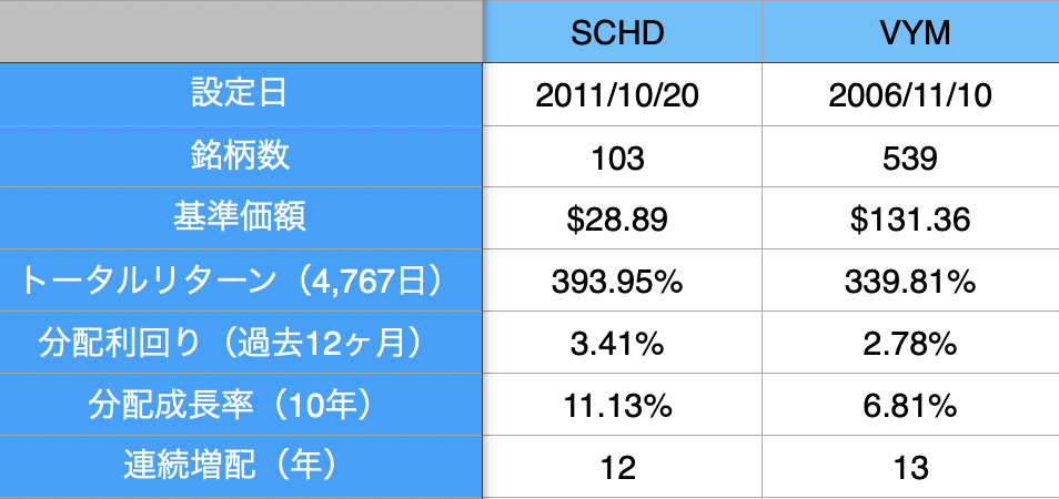 • 「SCHD」VS「VYM」分配利回り比較