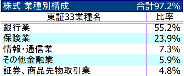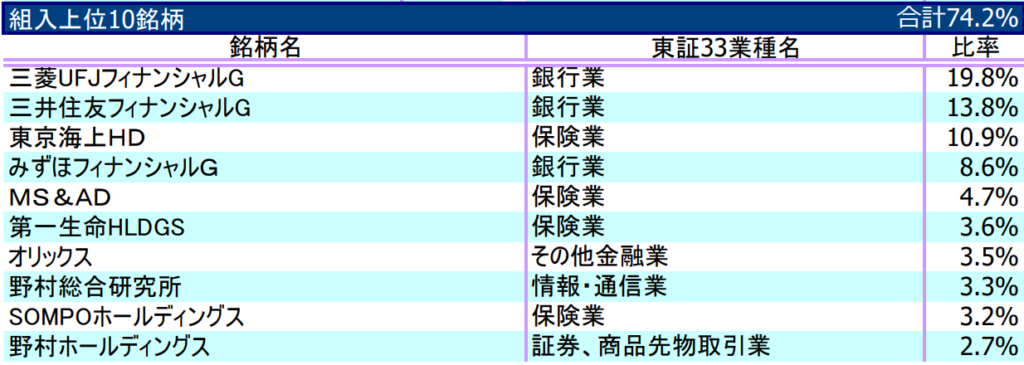 銀行、保険など金融大手が上位ですね。特に三菱UFGフィナンシャルGが20%弱とかなり大きな割合を占めています。1銘柄でこの割合の組み入れ比率はあまり見た事がないですね。