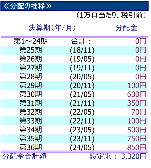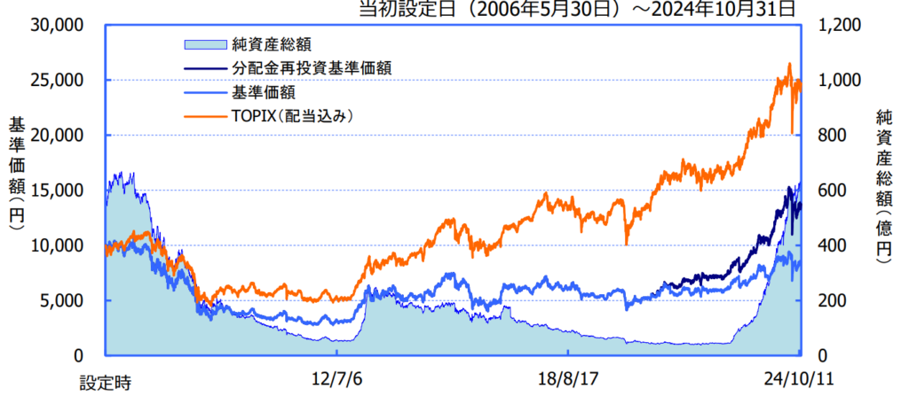 直近1年で+30.1%、3年で+103.7%の騰落率になります。また年2回の決算時分配金があり直近は増加傾向です。参考指数はTOPIXになっています。