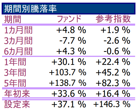 手数料が高いし、パフォーマンスも配当込みのインデックスに負けているのでこれはないかなと思います。せっかくセクター特化したファンドなのに、近年伸びている暗号資産関連も入っていないしインデックスにも負けているというのは致命的だと思います。