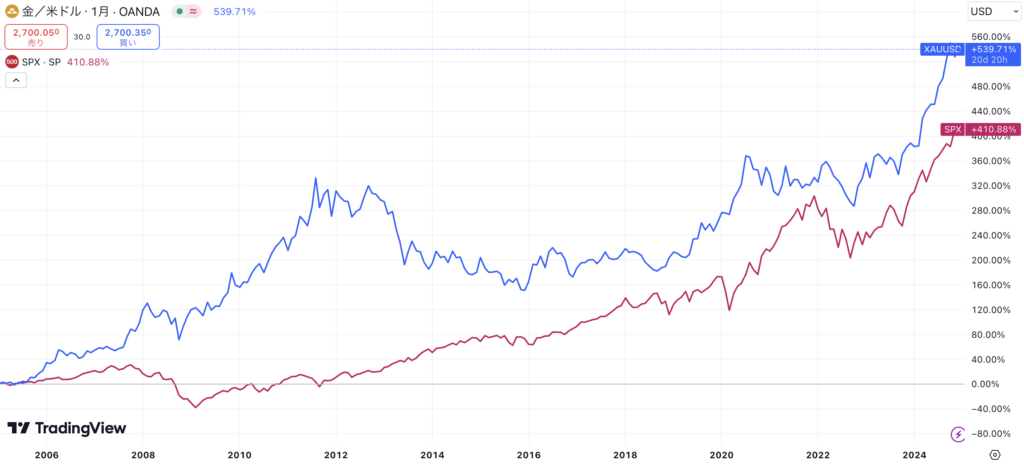 金とS&P500(SPX)のリターンで比較しても、この20年間、金のリターンがS&P500(SPX)のリターンを上回っております。