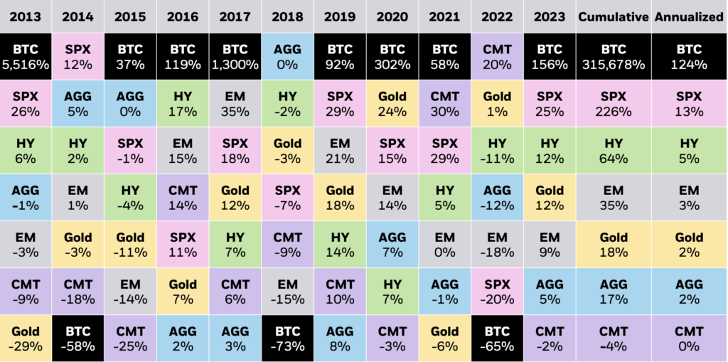これを見るとビットコインのリターンはS&P500のリターンに比べて、随分大きなリターンとなっていることが確認できます。