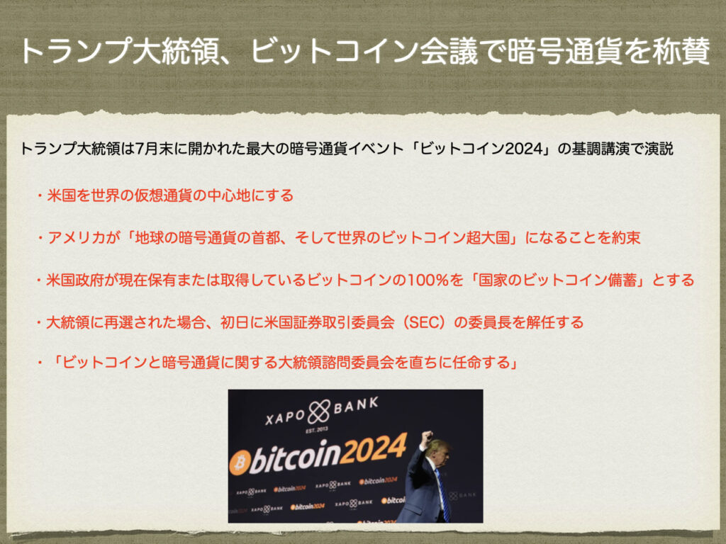 トランプ次期大統領は選挙前から暗号資産を称賛してきており、大統領に復帰後には「戦略的ビットコイン準備金」を設立すると述べてきております。