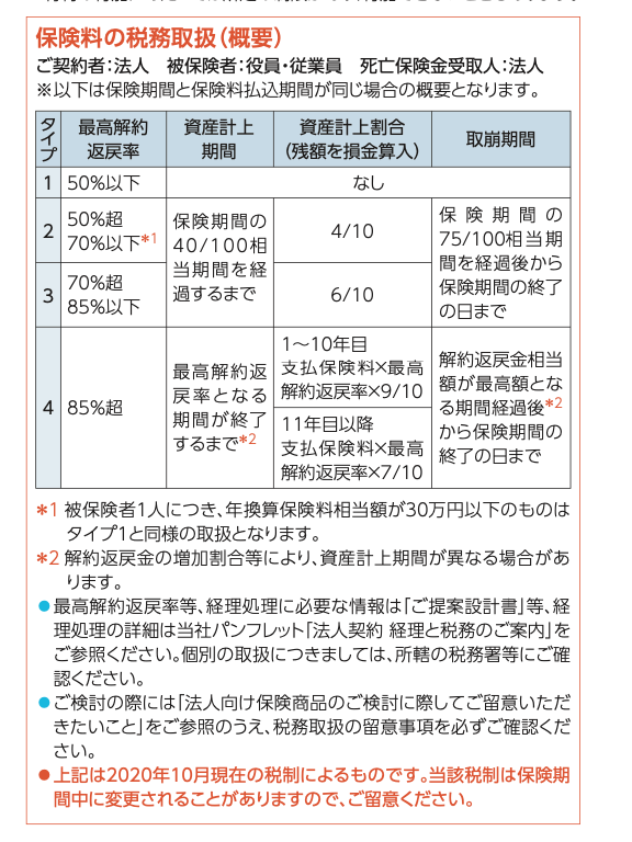 今回のケースですと、下記のタイプ4に該当しますので、1年目〜10年目に関して保険料に対しての損金割合は20%程度です。11年目以降に関しても約40%程度しか損金処理できず、かつての1/2損金効果は薄くなりました。