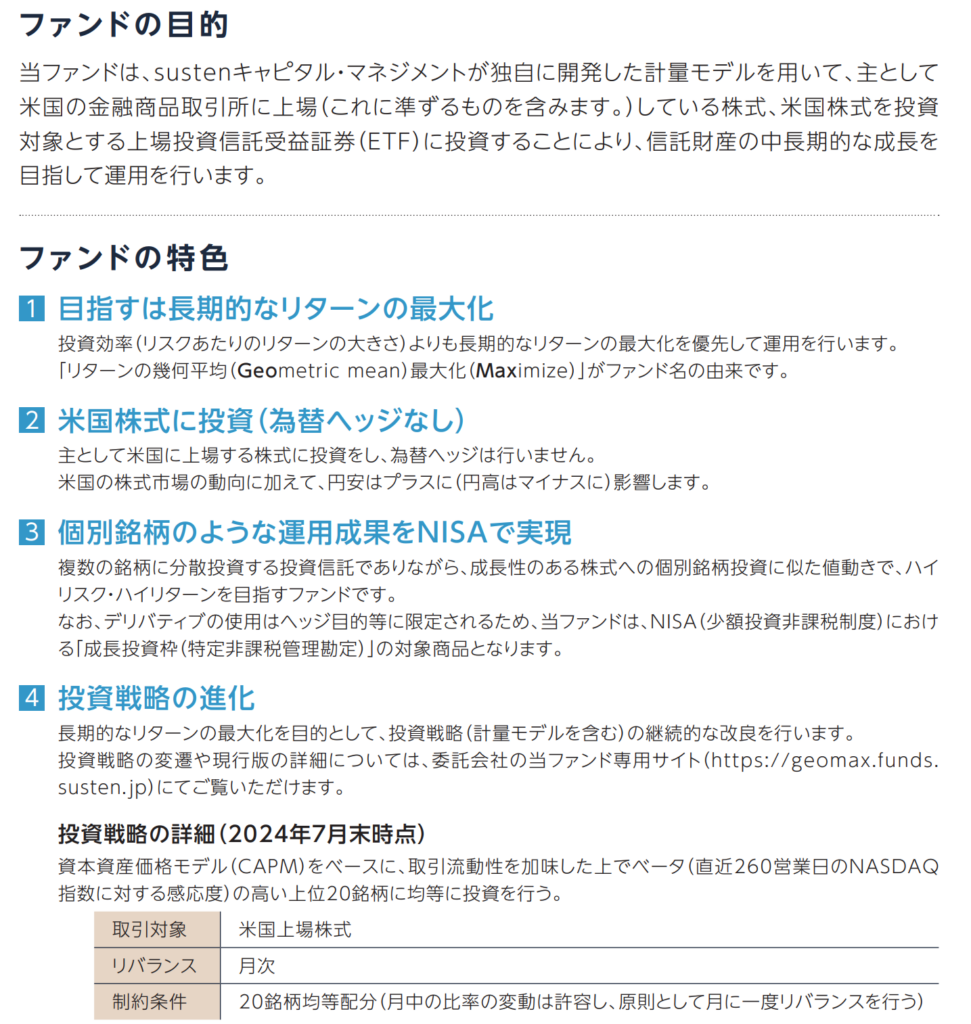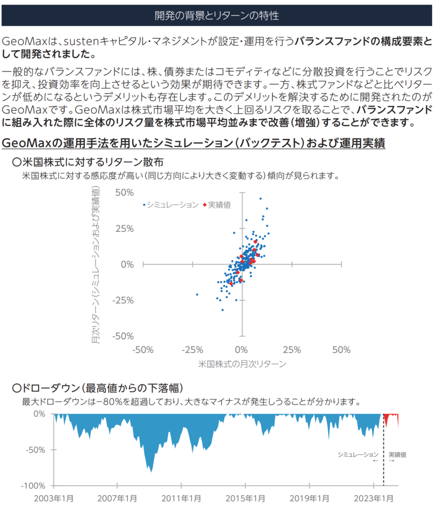 • sustenキャピタル・マネジメント「米国株式アグレッシブ・ポートフォリオ 愛称:GeoMax」は独自に開発した計量モデルを用いて米国株に投資するアクティブファンド