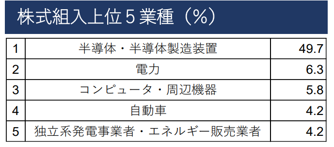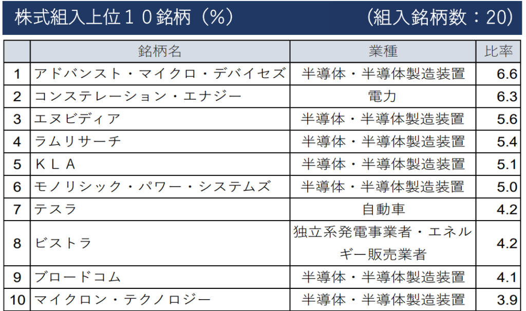 さすがハイリスク、ハイリターンを狙うだけあって半導体関連で50%弱と大きな割合を占めています。現在の投資先選定基準は米国に上場する株式のうち、Bloomberg ESGスコアが2.0以上かつ21日移動平均取引額が1千万ドル以上の銘柄から、金融工学を使って期待リターン上位20銘柄に機械的に投資しているようです。アクティブファンドではありますが、アクティブの中身がファンドマネージャーではなく金融工学を使うイメージです。