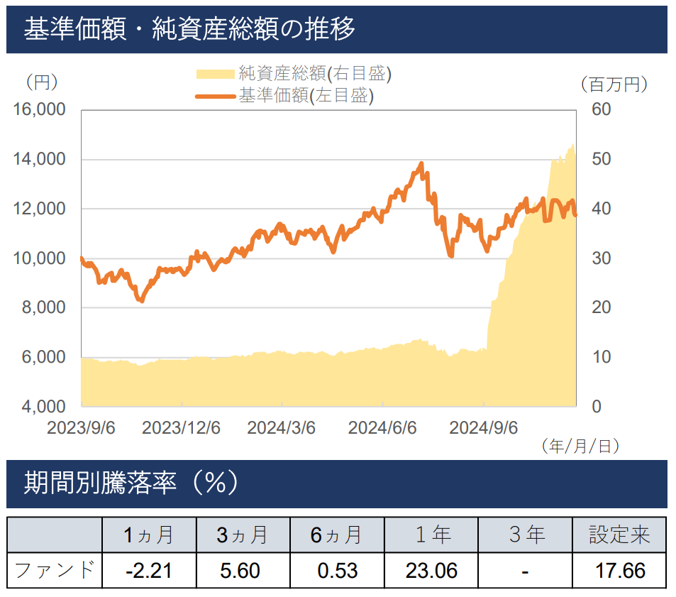 ファンド設定から1年3カ月程度ですが直近1年で+23.06%、設定来で+17.66%の騰落率になります。
