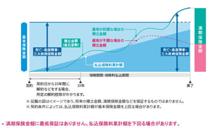 メットライフには「ライフインベスト」という普通の変額保険がありますが、それに三大疾病でも保険金が受け取れる保障を付加したのが「ライフインベストプラス」になります。変額保険とは、預かった保険料の一部を運用し、運用実績によって将来受け取る死亡保険金や解約返戻金、満期保険金が増減する保険の事です。ただし死亡保険金は最低保証があります。ざっくり言うと養老保険と投資信託を合体させた商品と思ってください。