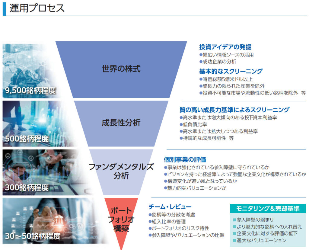運用指図権限を委託されているWCM社で企業文化、構造的成長力、バリュエーション等を勘案して個別銘柄を分析選定、日本を含む世界の成長株に集中投資します。