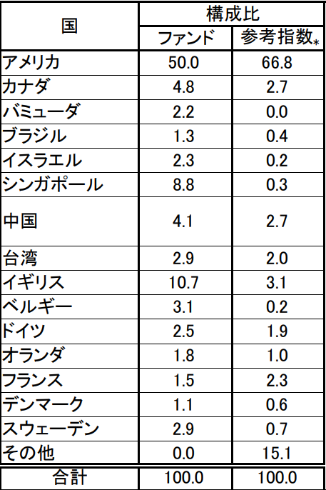 最近は世界株ファンドでもほぼ米国株というファンドが多いですが、このファンドは米国株を50%、その他の国で50%の比率になっています。また投資家から敬遠される事がある中国株なども入っていてカントリーリスクよりも個別企業の成長性を取りに行く姿勢が見えるかなと思います。組み入れ上記の企業を見てもFANG+銘柄などは少なく、盲目的に組み入れるのではなくしっかり個別企業を分析している印象があります。