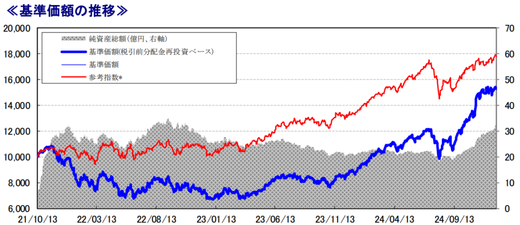 こちらのファンドは資産成長型と予想分配金提示型がありますが、今回は資産成長型の数値で解説します。直近1年で+70.7%、3年で+54.4%の騰落率になります。参考指数はのMSCI All Country World Index(配当込み、ドルベース)になっています。