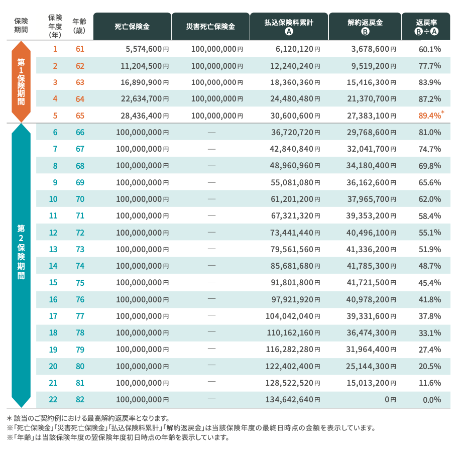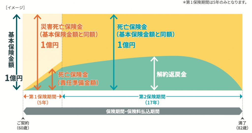 保障内容としては、ご契約から5年間は災害死亡保険金といって事故やコロナなどの感染症による死亡時は満額保障されますが、病気死亡は払い込み保険料の91%相当(責任準備金)の保険金額となります。