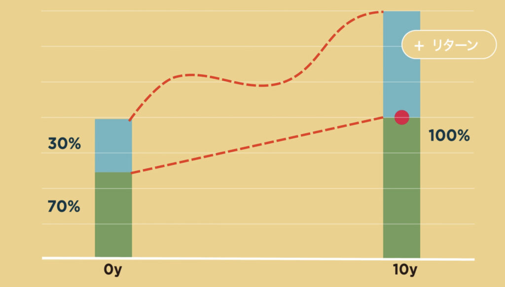 上の図で説明すると、元本の70%を安全性の高い債券などに投資して、これで満期時100%を確保し、元本の残りの30%でリスクをとった高いリターンを目指すという仕組みですね。