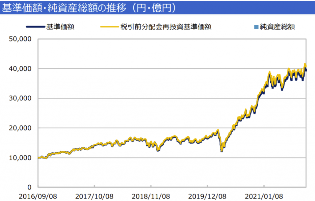 投資信託としての設定は2016/9/8設定になります。運用は5年と3カ月程度ですが、設定来310.2%のプラス、この1年では56.4%のプラスになります。設定時から投資していた場合、コロナショックでも元本割れにならず、その後V字回復しています。