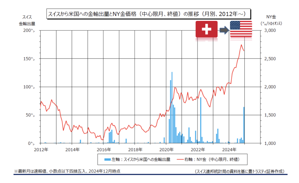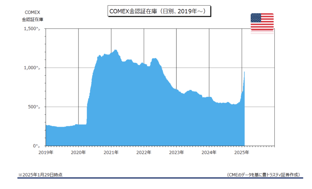 2024年11月に米大統領選でトランプ氏が勝利して以降、関税リスクを回避しようと、金取引業者や金融機関は1月下旬までに約400トンの金塊をCOMEX(ニューヨーク商品取引所)の保管庫に移送し、COMEXの金の総在庫は約962万トンに増加しているとのことです。
