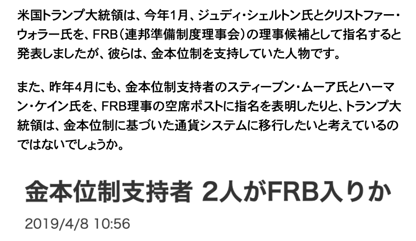 2020年4月のブログ「「金」で資産防衛しましょう」の記事において、トランプ大統領は、中央銀行が所有している「通貨発行権」を国家に取り戻そうと、ドルの価値を下げようとしており、その先として、金本位制に基づいた通貨システムを考えているのではないかと述べました。