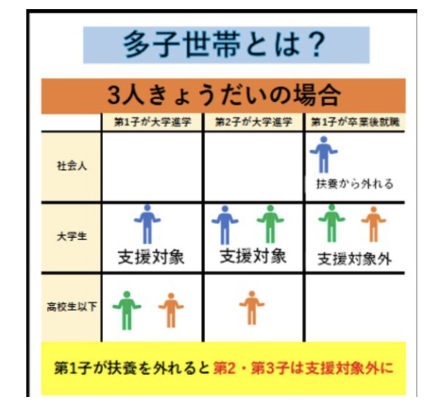 例えば、3人兄弟姉妹のうち、長子が就職して扶養から外れた場合、扶養する子どもの数が2人となるため、支援の対象外となります。
