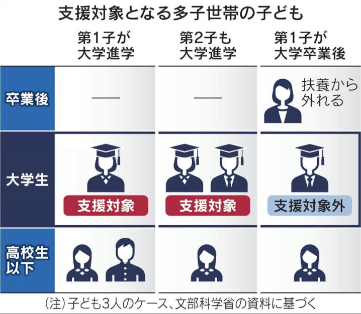 - 2025年度から開始される多子世帯向けの大学無償化制度は、子どもを3人以上扶養する家庭にとって、大きな経済的支援となります