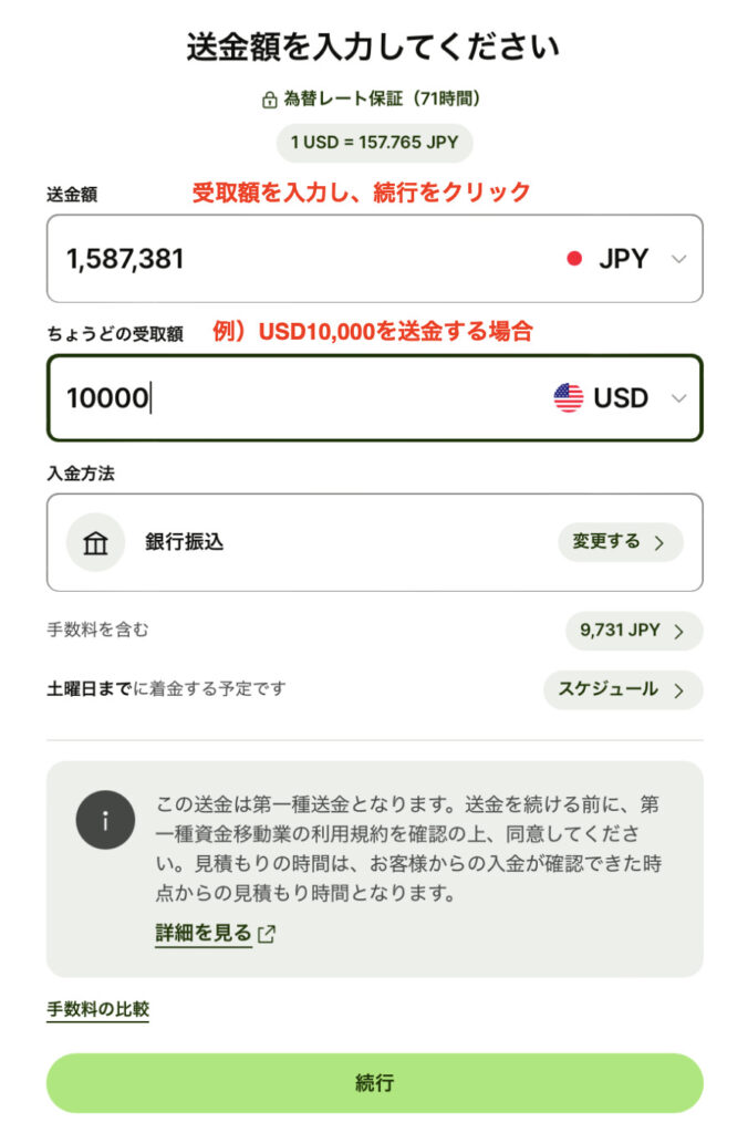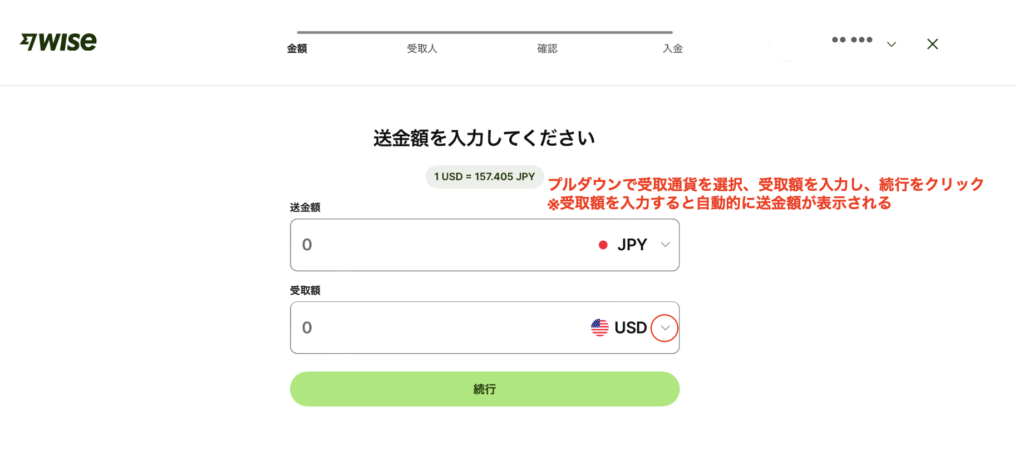 「受取額のプルダウン」から受取通貨を選択して「続行」をクリックします。