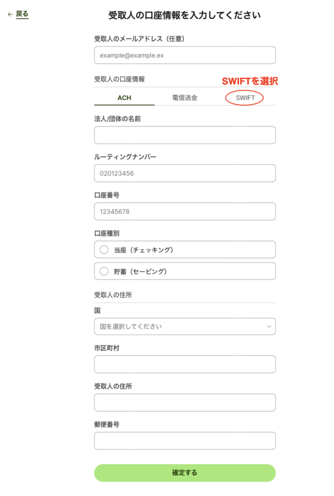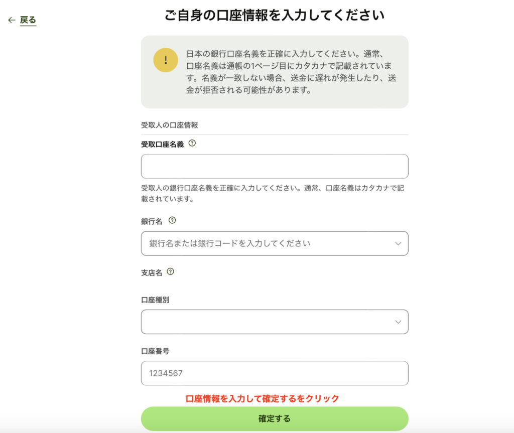 口座情報を入力して「確定する」をクリックします。