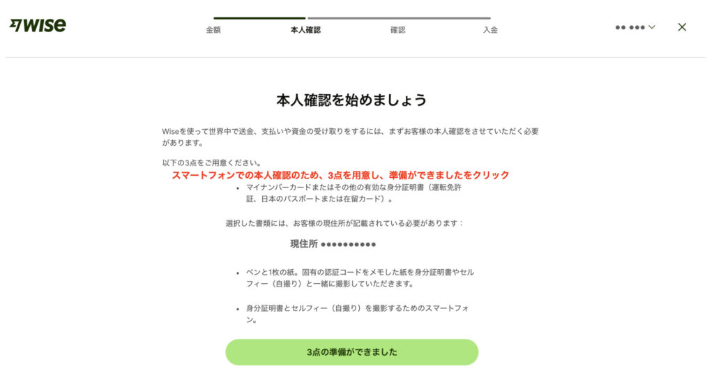 スマートフォンでの本人確認のため、3点(マイナンバーカードなど、ペンと1枚の紙、スマートフォン)を用意し、「3点の準備ができました」をクリックします。