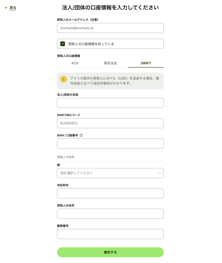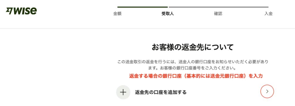 返金する場合の銀行口座(基本的には送金元銀行口座)を入力します。
