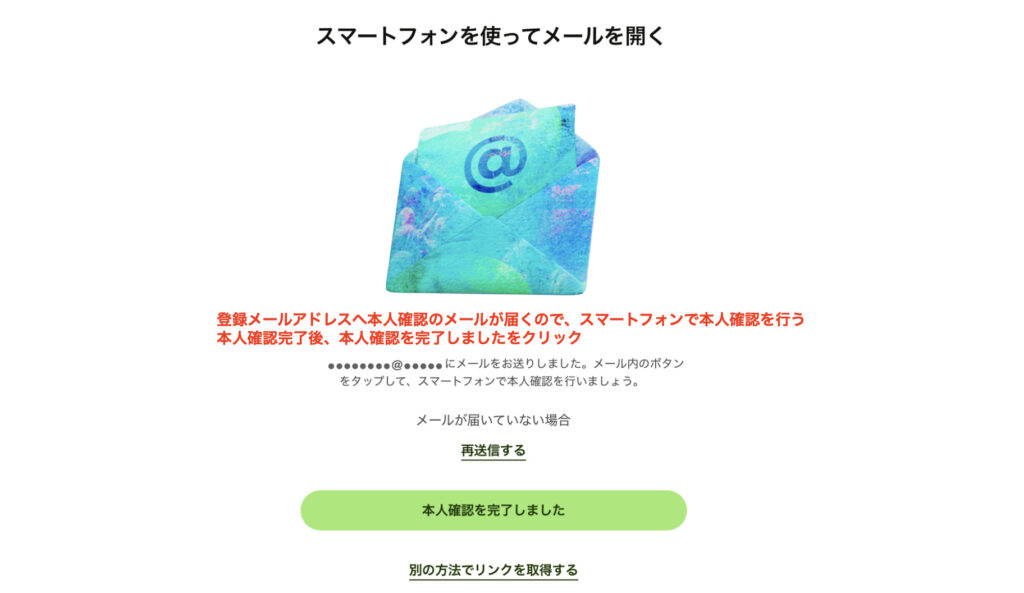 登録メールアドレスへ本人確認のメールが届くので、スマートフォンで本人確認を行う。本人確認完了後「本人確認を完了しました」をクリックします。