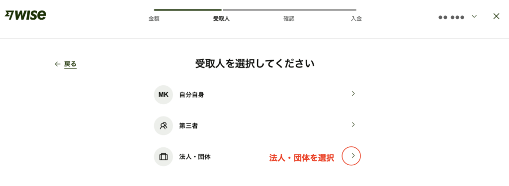 受取人の選択をします。送金先が法人であれば「法人・団体」クリックします。