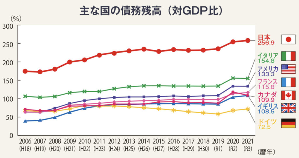 大規模な国債購入により、政府の財政赤字は日銀によって事実上ファイナンスされる形となりました。これにより、政府は財政規律を維持するインセンティブが低下し、結果として公的債務残高は対GDP比で先進国中最も高い水準に達しています。