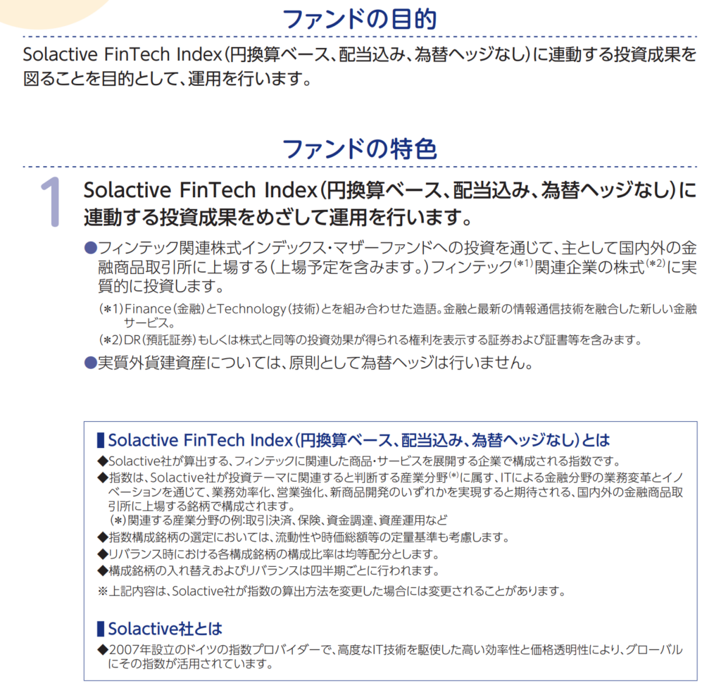 インデックスなのでシンプルに指数連動です。対象インデックスはSolactive FinTech Index(円換算ベース、配当込み、為替ヘッジなし)となります。