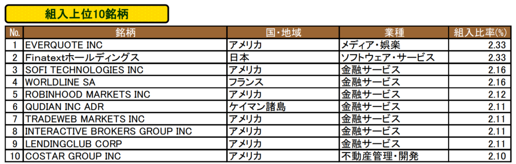 フィンテックのインデックスだけあって、業種は金融サービスが多いですね。ROBINHOODなどは日本でもニュースに登場するのでご存じの方も多いのではないでしょうか。