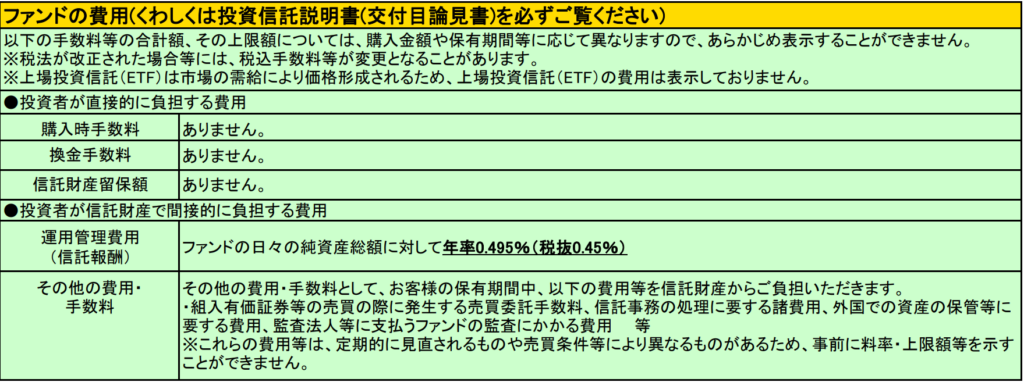 購入時手数料は先ほど触れた通りありません。毎年の管理費用は0.495%程度、その他手数料もかかります。