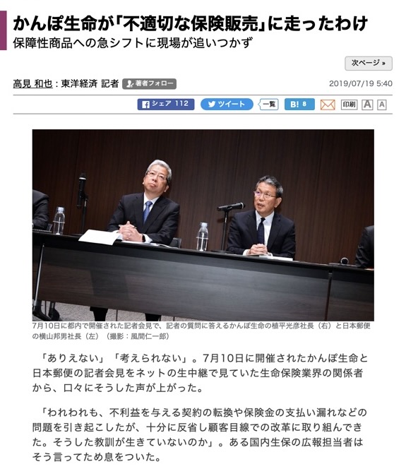 香港で保険契約を結ぶ際には必ず「Replacement Declaration」という「保険転換契約を結ぶ際の注意」を理解したことに同意をする書面にサインをしなければならず、勿論これ自体は日本でも同じなのでしょうが、香港では新規契約が「保険転換契約」と見なされた場合は販売側に膨大な説明責任、即ち「何故、既存の保険契約から新しい保険に乗り換えることがクライアントの利益となるのか」ということを証明する義務が生じ、違反すると販売員としての活動自粛を求められたり、場合によっては営業ライセンスの没収に繋がる為、迂闊に「保険見直し」なんて勧められないのです。しかも不祥事が発生した場合には、ご丁寧に監督当局から当事者の実名、不祥事や発生経緯、刑罰・懲罰等が明記されたEメールがライセンス登録者に送られ大勢の人の間で回覧されますから、香港の保険販売者はかなり高いプレッシャーの下で業務に臨んでいます。私も実際に、当局から送られてきたEメールの中に嘗ての同僚の名前を見付けて驚いたという経験があります。そんな香港の保険業界従事者の目に、かんぽ生命の件などはどのように映るのでしょうか…