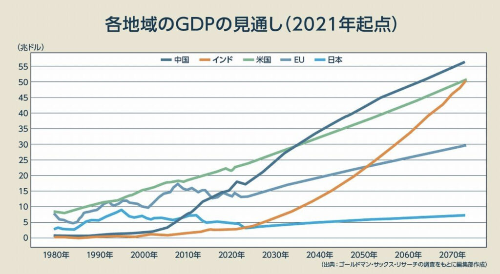 インドの経済成長は、近年の6~7%の成長率を維持しながら、2050年には名目GDPが約30兆ドルに達すると予測されています。これは、現在の米国のGDP規模に匹敵するレベルであり、世界第2位の座を確立する要因となります。