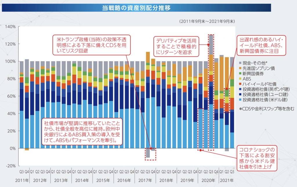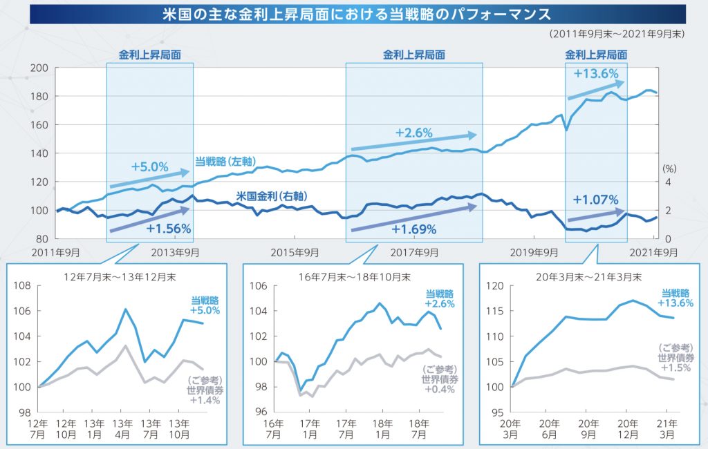 とはいえ、理屈で言うとやはり金利上昇局面では債券価格は下がるものです。けれどこのファンドはこれまで3度の金利上昇局面でもリターンを出しているようです。