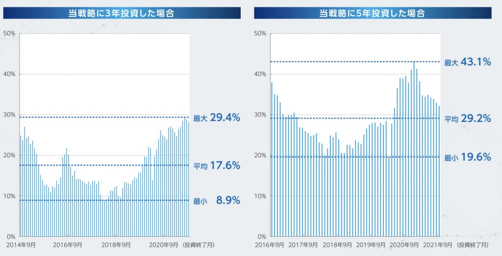 最後に実際投資をしたら、今後どのくらいのリターンになるのか目安を見てみましょう。まずこれが一番直近(2021.9)の投資配分です。