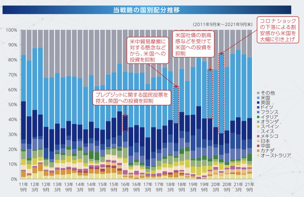 個人投資家が投資できるようなはソブリン債ハイイールド債新興国債券以外の資産へも投資しています。これまでどのような配分で投資してきたか?こちらでわかります。