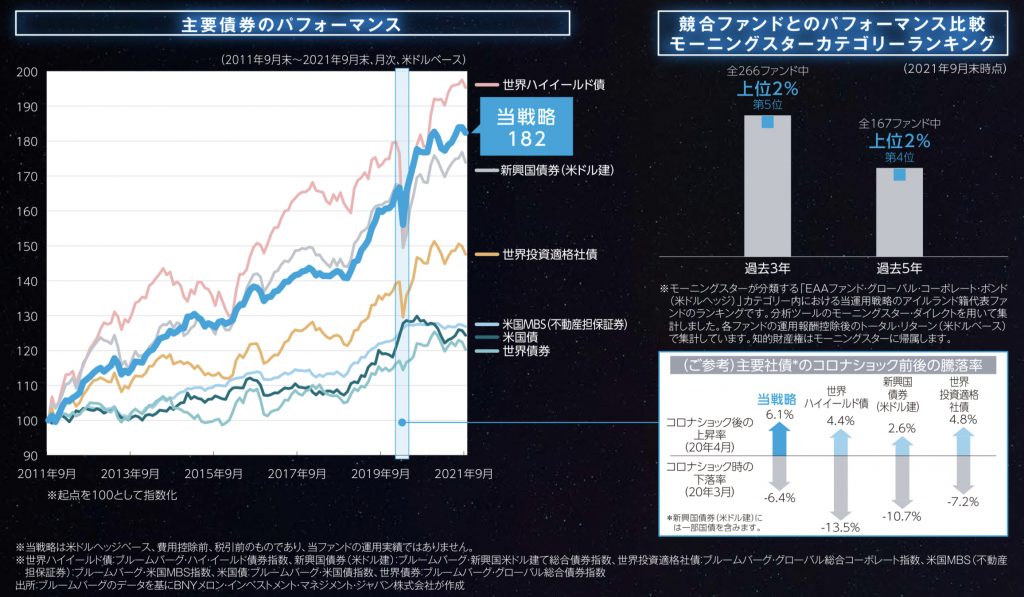 オリジナルのファンドのパフォーマンスもその他債券ファンドと比べるとかなり優秀で、リターンはもちろん、下落リスクに強いということがわかります。