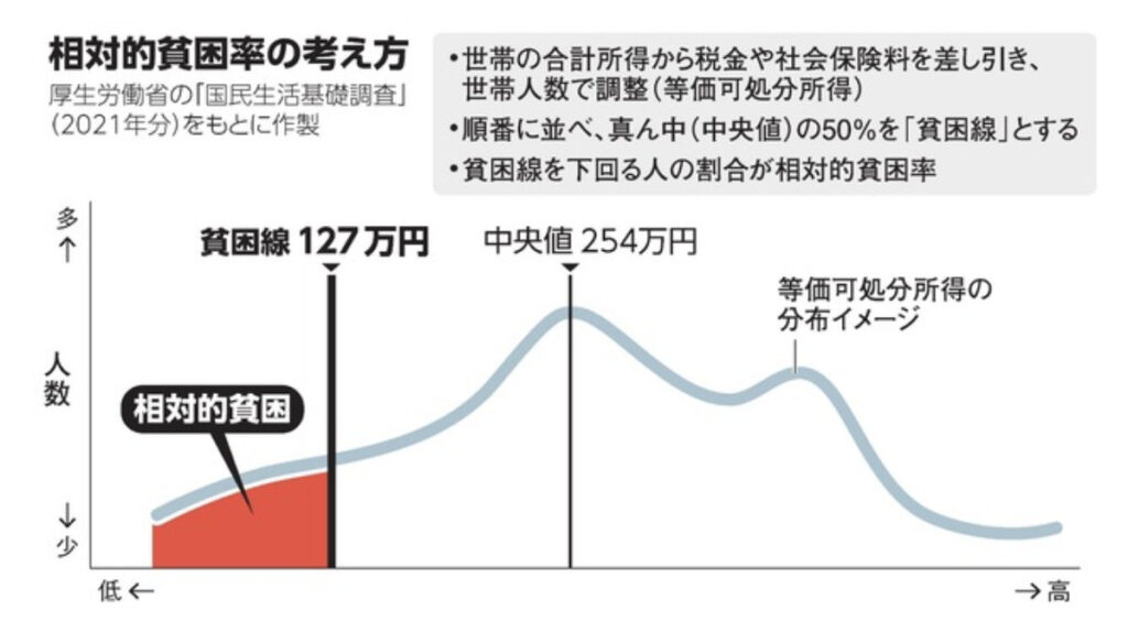 みなさんは「相対的貧困」という言葉を聞いたことがあるでしょうか?相対的貧困とは、その社会における 標準的な生活水準 と比べて経済的に厳しい状態のことです。具体的には、国や地域ごとの所得水準の中央値(ちょうど真ん中の人の所得)の半分に満たない所得しかない人々の割合を指します 。ものすごくざっくり言えば、収入をずらっと並べたときに真ん中の値の半分以下しか収入がない人たちが「貧困」とみなされるわけです。