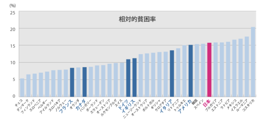 では、日本の相対的貧困率は世界と比べて高いのでしょうか、それとも低いのでしょうか?結論から言うと、日本の貧困率は他の先進国と比べてもかなり高い水準です。経済協力開発機構(OECD)のデータによれば、日本の貧困率15.4%は、アメリカ(15.1%)や韓国(15.3%)よりも高く、主要先進国の中で最悪の水準と報じられました 。OECD加盟国の平均的な貧困率はだいたい11%前後と言われますので、日本は平均より明らかに上回っています。またヨーロッパの国々を見ると、例えばフランスやドイツは約10%前後、北欧のフィンランドやデンマークでは6~7%台といった具合に、日本よりかなり低い貧困率に抑えられています。