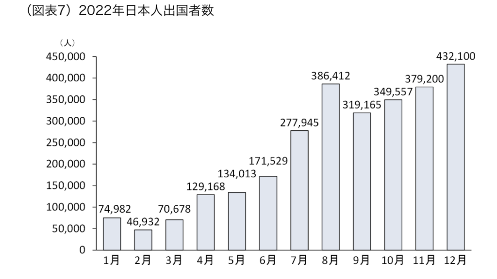 • 海外旅行者数の激減: パンデミック中、日本人の海外旅行者数は一時的にほぼゼロに近い水準まで減少しました。
