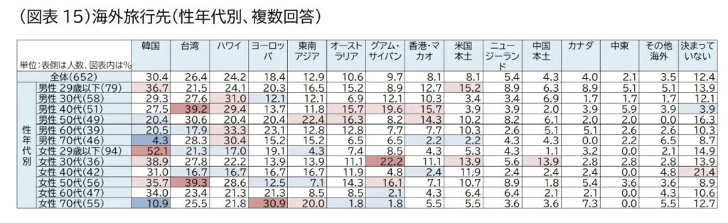 • アメリカ(特にハワイ)やヨーロッパも定番ですが、旅行コストが高いため若年層より中高年層に支持されています。