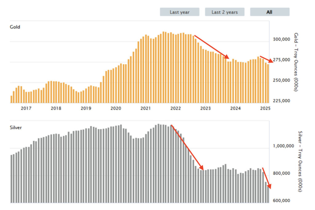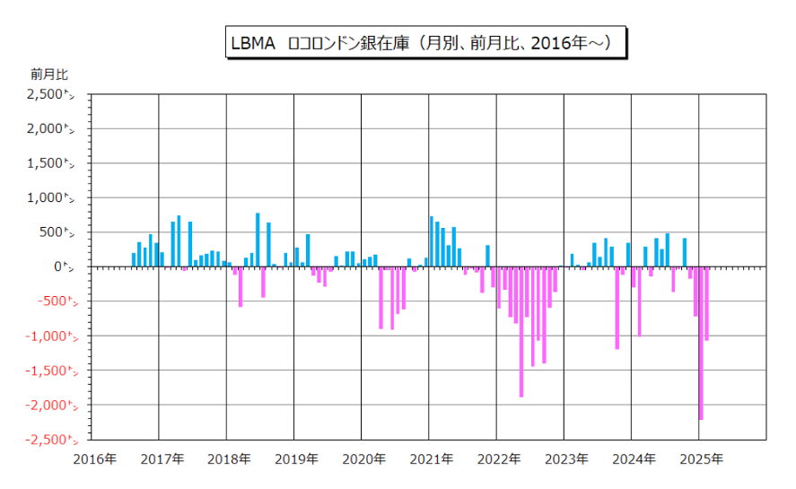 しかしながら、ロンドン市場における銀保有量は、2022以降、大きく減少してきており、その減少幅は金よりも大きいです。